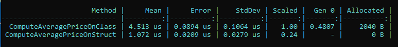 ComputeAveragePriceOnStruct | 850.5 ns | 4.484 ns | 3.500 ns | 0.21 | – | 0 B |